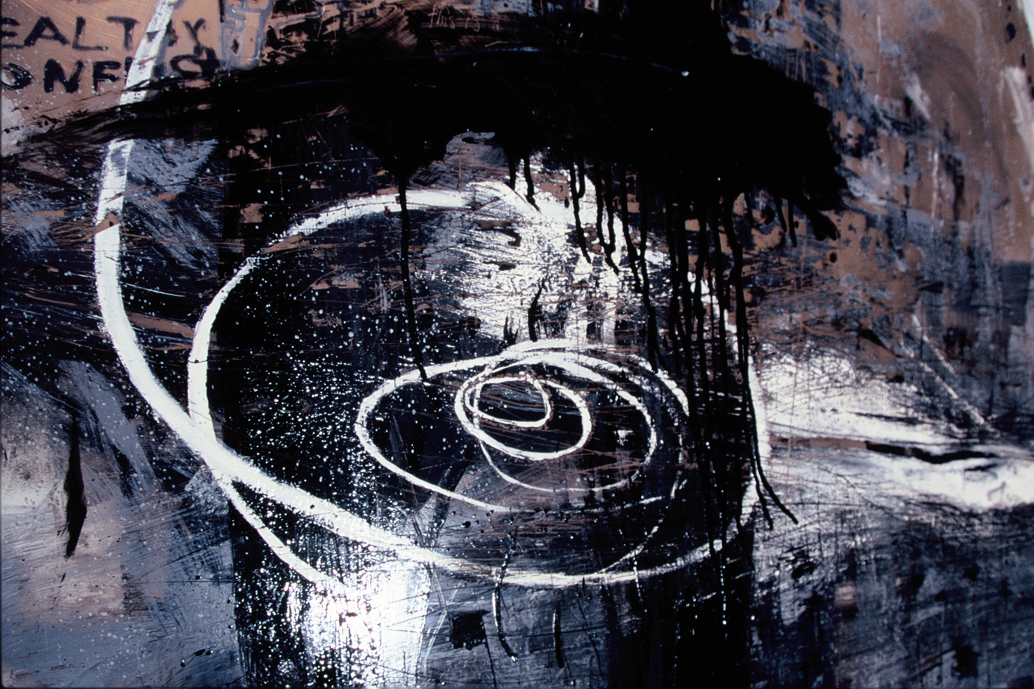MEDIUMS: Enamel (black and white), engraving tools, black pens and correction fluid.