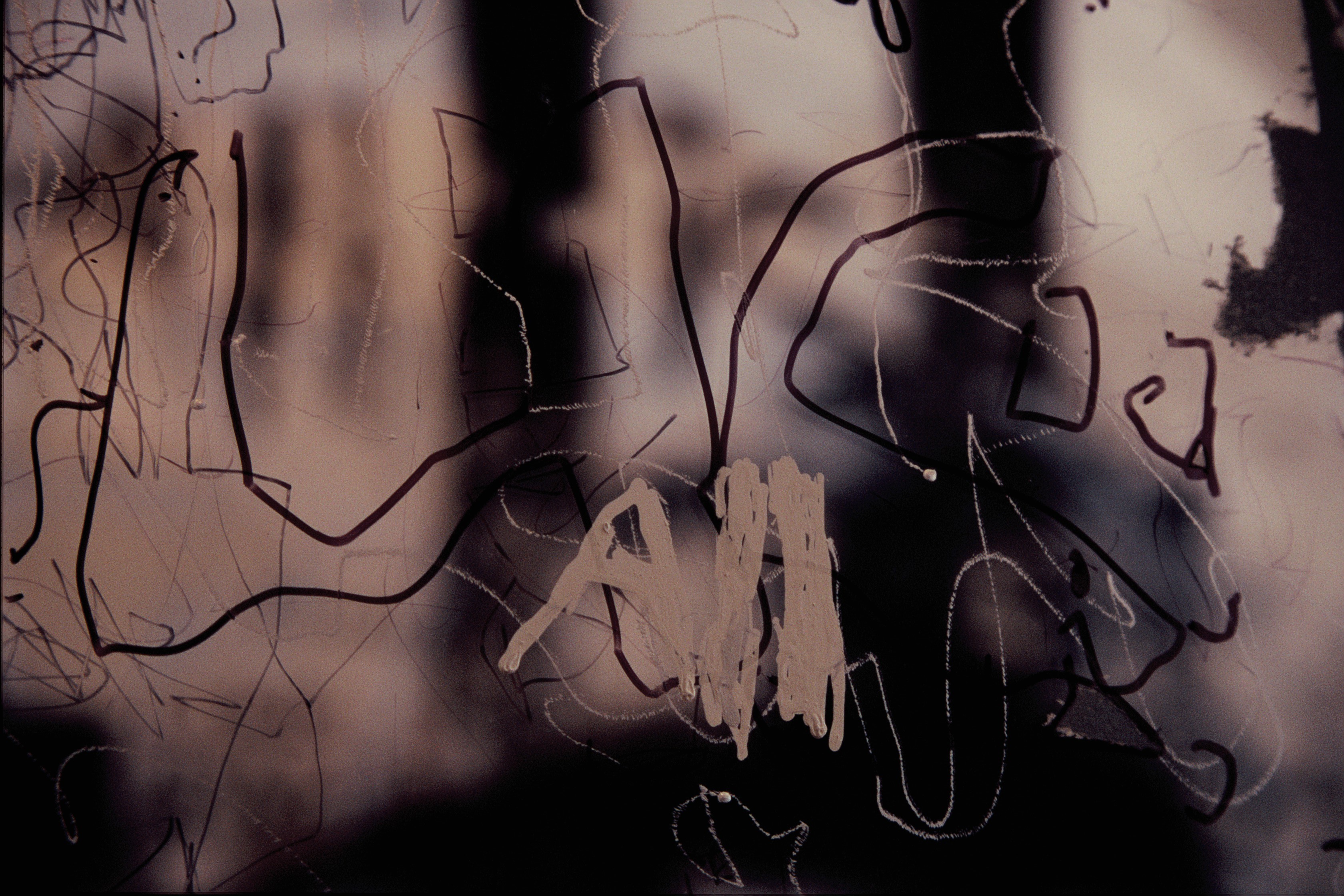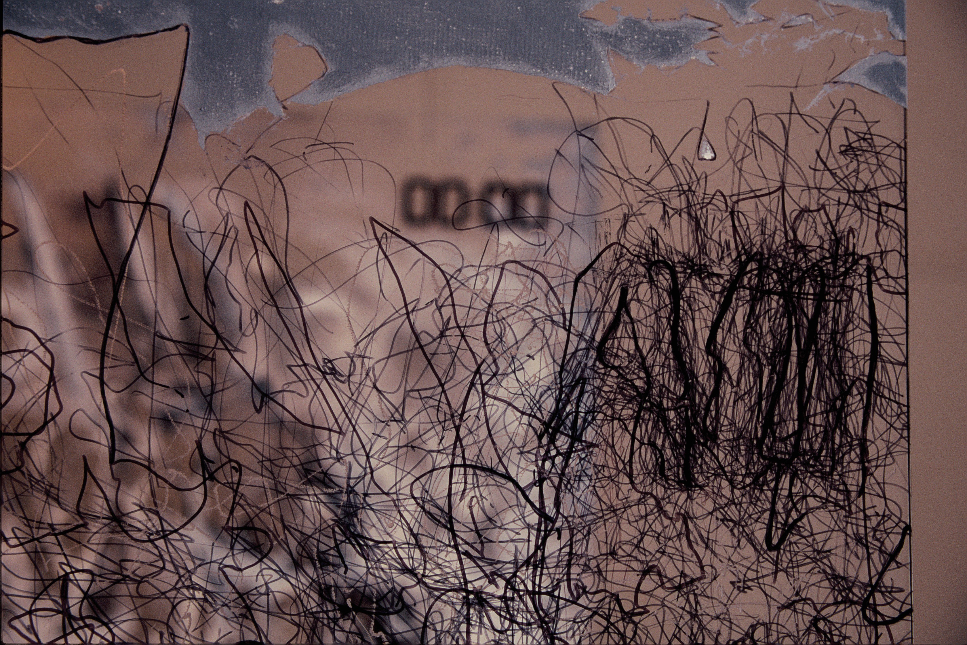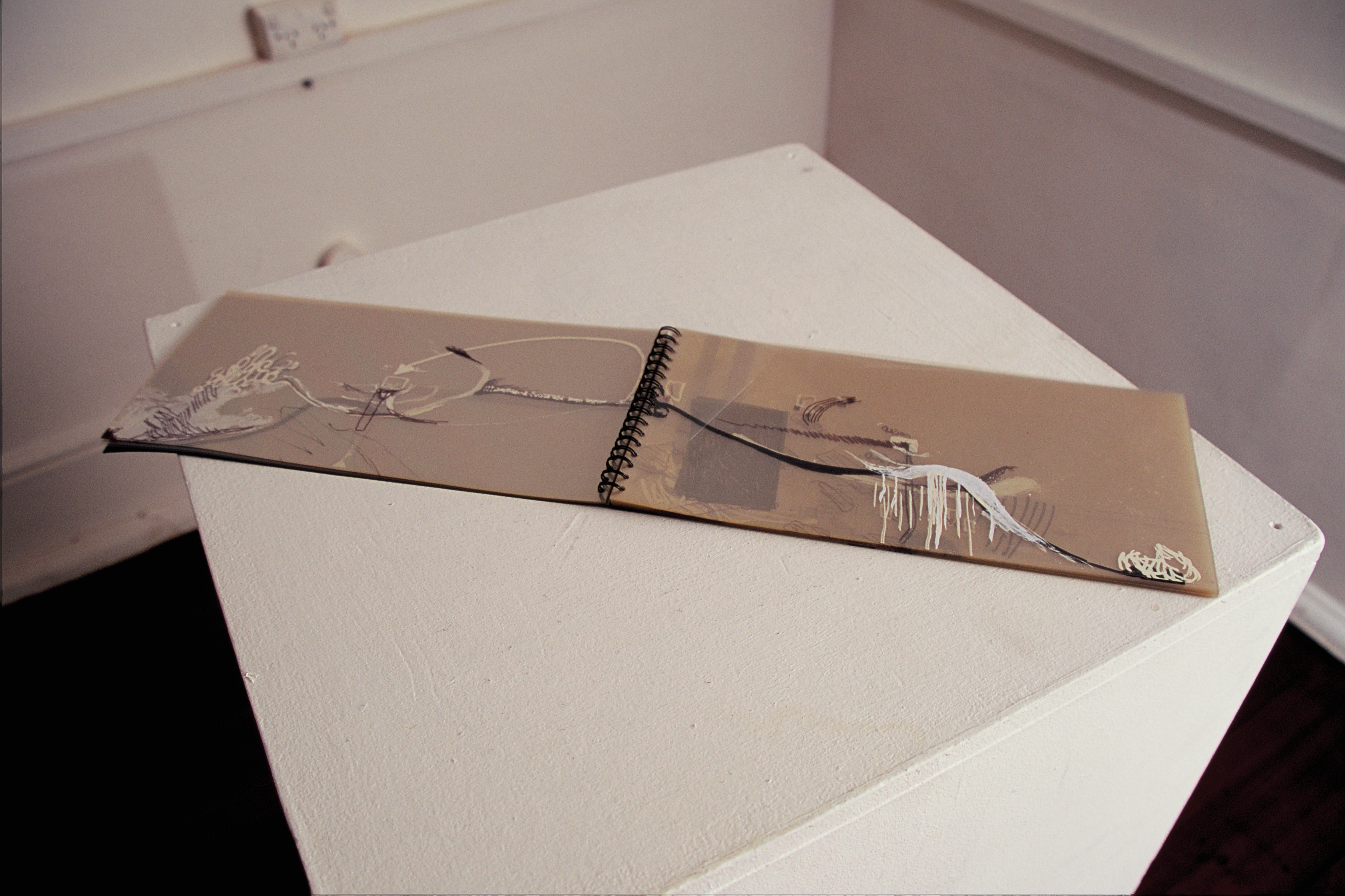 PROCESS: THE CONVERSATION (MIDDLE SHEET) ARTIST’S POSITION: Each artist works on opposing sides of the same acrylic sheet. PARAMETERS: 10-minute intervals per artist (alternating). NOTE: Each mark documented in the book displayed on plinth.