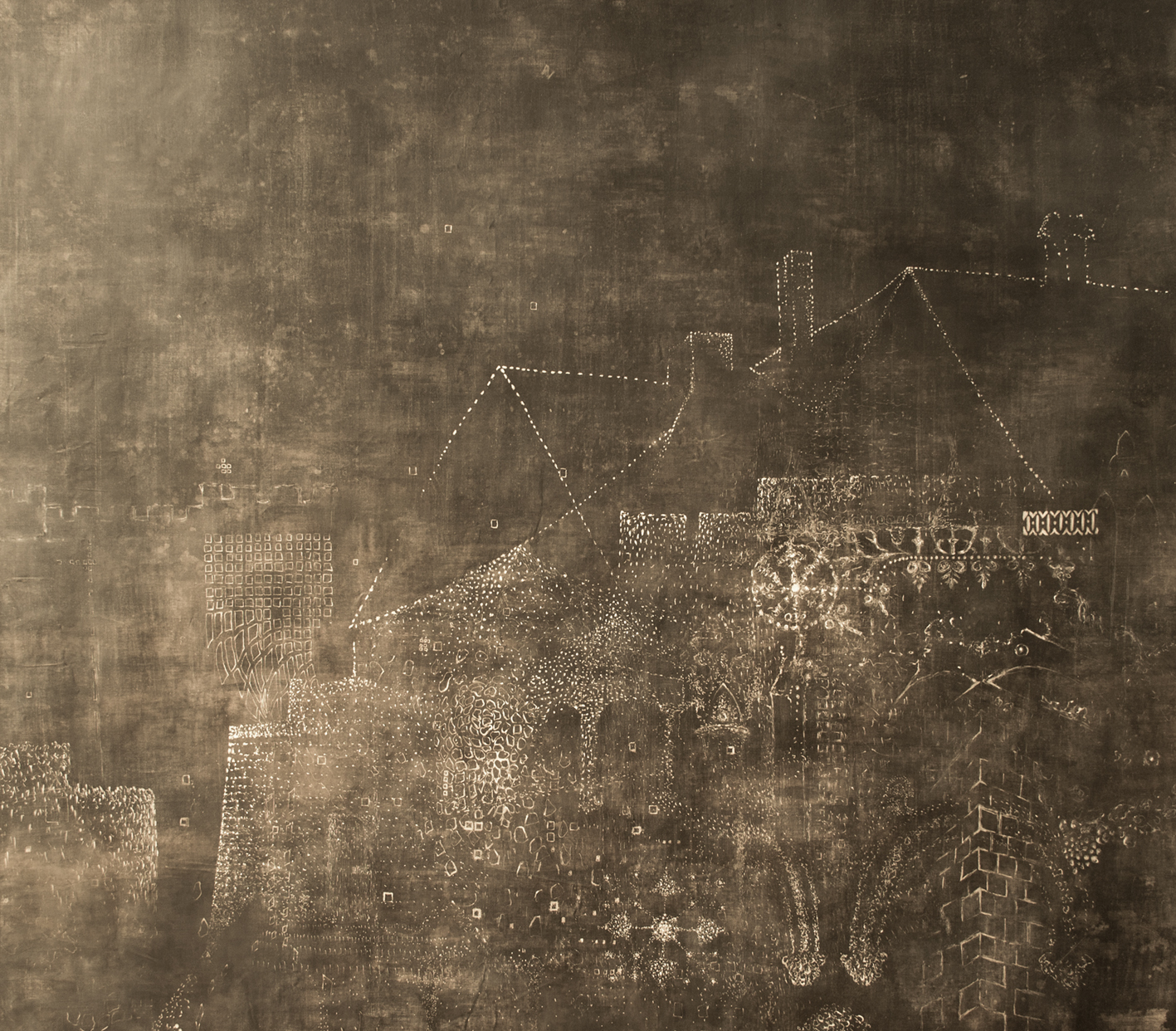 Versions of the past imprinted on the facades of the buildings of Perth. The decorative remains of bygone eras. Decorations constructed, borrowed, transplanted from other eras, other cultures, other lands. Reading the stories of white settlement I began to see distorted patterns which became white markings on our dark history written on another’s land. In the end, it seemed all that remains are these facades. These decorative facades. – Mel Dare