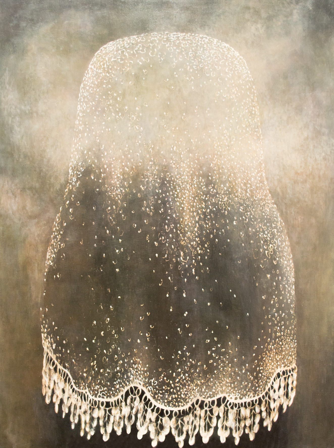 This painting is part of a body of work which began in the Czech Republic while visiting my mother’s homeland. Immersed in its beauty and history full of dark passages I developed a further interest in the notion of self. How the individual is constructed, threaded together by divergent strands of culture combined with the time and place it exists. Gentle strands and crude stitches forming patterns of conditioning imposed by external and internal influences. Shaped by our simple all-consuming need for survival and our equally strong desire for comfort.